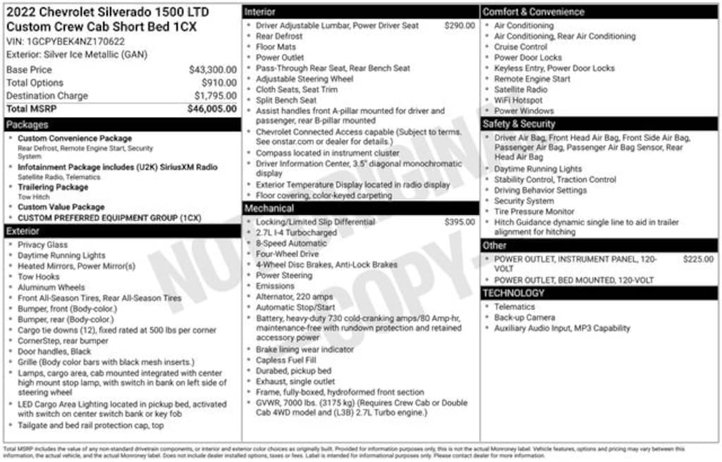 Key Chrysler Dodge Jeep Ram of Rochester is proud to present you with another True Market Priced Pre-Owned Vehicle. Transparent Pricing Of $ !! This 2022 Chevrolet Silverado 1500 LTD Custom is loaded with the following Factory Options: Custom Convenience Package (Electric Rear-Window Defogger, EZ Lift Power Lock & Release Tailgate, LED Cargo Area Lighting, Remote Vehicle Starter System, and Theft Deterrent System (Unauthorized Entry)), Custom Value Package, Infotainment Package (Chevrolet Connected Access Capable, OnStar & Chevrolet Connected Services Capable, SiriusXM Radio, and Wi-Fi Hot Spot Capable), Preferred Equipment Group 1CX (3.5" Monochromatic Display Driver Info Center, Bluetooth® For Phone, Body Color Grille, Color-Keyed Carpeting Floor Covering, Compass, Deep-Tinted Glass, Electronic Cruise Control, Front Frame-Mounted Black Recovery Hooks, Front Rubberized Vinyl Floor Mats, Manual Tilt Wheel Steering Column, Power Door Locks, Power Front Windows w/Driver Express Up/Down, Power Front Windows w/Passenger Express Down, Power Rear Windows w/Express Down, Rear 60/40 Folding Bench Seat (Folds Up), Rear Rubberized-Vinyl Floor Mats, Remote Keyless Entry, and Standard Tailgate), Trailering Package (Hitch Guidance), 10-Way Power Driver Seat w/Lumbar, 120-Volt Bed Mounted Power Outlet, 120-Volt Instrument Panel Power Outlet, 3.42 Rear Axle Ratio, 4-Wheel Disc Brakes, 40/20/40 Front Split Bench Seat, 6 Speakers, 6-Speaker Audio System, ABS brakes, Air Conditioning, Alloy wheels, AM/FM radio: SiriusXM, Apple CarPlay/Android Auto, Auto-Locking Rear Differential, Brake assist, Bumpers: body-color, Cloth Seat Trim, Delay-off headlights, Driver door bin, Driver vanity mirror, Dual front impact airbags, Dual front side impact airbags, Electronic Stability Control, Front anti-roll bar, Front Center Armrest w/Storage, Front reading lights, Front wheel independent suspension, Fully automatic headlights, Heated door mirrors, Heavy Duty Suspension, Illuminated entry, Low tire pressure warning, Occupant sensing airbag, Outside temperature display, Overhead airbag, Overhead console, Panic alarm, Passenger door bin, Passenger vanity mirror, Power door mirrors, Power steering, Power windows, Premium audio system: Chevrolet Infotainment 3, Radio data system, Radio: Chevrolet Infotainment 3 System, Rear reading lights, Rear step bumper, Rear window defroster, Remote keyless entry, Security system, Speed control, Speed-sensing steering, Split folding rear seat, Tachometer, Tilt steering wheel, Traction control, Trip computer, Variably intermittent wipers, Voltmeter, and Wheels: 20" x 9" Bright Silver Painted Aluminum!!