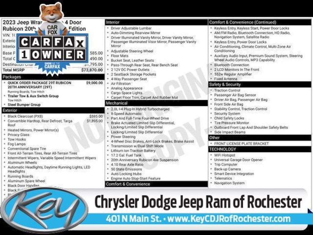 Key Chrysler Dodge Jeep Ram of Rochester is proud to present you with another True Market Priced Pre-Owned Vehicle. Transparent Pricing Of $ 32995 !! This 2023 Jeep Wrangler Rubicon 20th Anniversary Edition 4xe is loaded with the following Factory Options: 2.0L I4 DOHC, ABS brakes, Alloy wheels, Compass, Electronic Stability Control, Front dual zone A/C, Heated door mirrors, Illuminated entry, Low tire pressure warning, Navigation System, ParkView Rear Back-Up Camera, Passenger door bin, Remote keyless entry, and Traction control 2.0L I4 DOHC, ABS brakes, Alloy wheels, Compass, Electronic Stability Control, Front dual zone A/C, Heated door mirrors, Illuminated entry, Low tire pressure warning, Navigation System, ParkView Rear Back-Up Camera, Passenger door bin, Remote keyless entry, Traction control, 4-Wheel Disc Brakes, 4.10 Rear Axle Ratio, 9 Speakers, Air Conditioning, AM/FM radio: SiriusXM, Apple CarPlay/Android Auto, Auto-dimming Rear-View mirror, Automatic temperature control, Brake assist, Delay-off headlights, Driver door bin, Driver vanity mirror, Dual front impact airbags, Dual front side impact airbags, Emergency communication system: SiriusXM Guardian, Front anti-roll bar, Front Bucket Seats, Front Center Armrest w/Storage, Front fog lights, Front reading lights, Fully automatic headlights, Garage door transmitter, Integrated roll-over protection, Occupant sensing airbag, Outside temperature display, Panic alarm, Passenger vanity mirror, Performance Suspension, Power door mirrors, Power steering, Power windows, Premium Cloth Low-Back Bucket Seats, Radio data system, Radio: Uconnect 4C Nav w/8.4" Display, Rear anti-roll bar, Rear reading lights, Security system, Speed control, Split folding rear seat, Steering wheel mounted audio controls, Tachometer, Telescoping steering wheel, Tilt steering wheel, Trip computer, Variably intermittent wipers, Voltmeter, and Wheels: 17" x 7.5" Machined w/Black Pockets!!