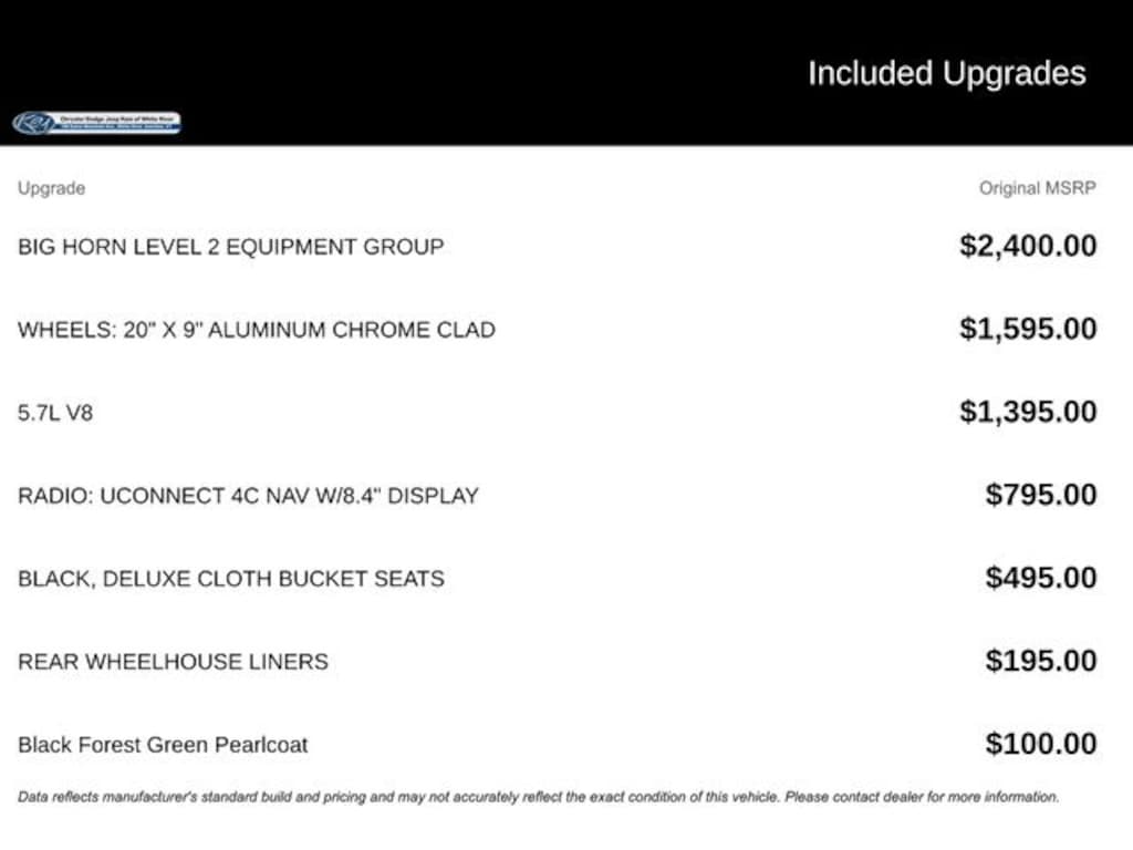 Key Chrysler Dodge Jeep Ram of White River is proud to present you with another True Market Priced Pre-Owned Vehicle. Transparent Pricing Of $ !! This 2019 Ram 1500 Big Horn/Lone Star is loaded with the following Factory Options: Big Horn Level 2 Equipment Group (8.4" Touchscreen Display, Air Conditioning ATC w/Dual Zone Control, Integrated Center Stack Radio, ParkSense Front/Rear Park Assist w/Stop, Remote Start System, Single Disc Remote CD Player, and SiriusXM Satellite Radio), Quick Order Package 25Z Big Horn/Lone Star, 1-Year SiriusXM Radio Service, 1-Yr SiriusXM Guardian Trial, 3 Rear Seat Head Restraints, 3.21 Rear Axle Ratio, 4 Way Front Headrests, 4-Wheel Disc Brakes, 48V Belt Starter Generator, 5-Year SiriusXM Traffic Service, 5-Year SiriusXM Travel Link Service, 6 Speakers, ABS brakes, Air Conditioning, Alloy wheels, AM/FM radio, Apple CarPlay, Brake assist, Bumpers: chrome, Cloth Bench Seat, Compass, Delay-off headlights, Disassociated Touchscreen Display, Driver door bin, Dual front impact airbags, Dual front side impact airbags, Electronic Stability Control, For Details, Visit DriveUconnect.com, For More Info, Call 800-643-2112, Front anti-roll bar, Front Center Armrest w/Storage, Front fog lights, Front reading lights, Front Seat Back Map Pockets, Front wheel independent suspension, Fully automatic headlights, Google Android Auto, GPS Antenna Input, GPS Navigation, HD Radio, Heated door mirrors, Illuminated entry, Leather steering wheel, Low tire pressure warning, No Satellite Coverage w/HI/AK/PR/VI/GU, Occupant sensing airbag, Outside temperature display, Overhead airbag, Overhead console, Panic alarm, ParkView Rear Back-Up Camera, Passenger door bin, Passenger vanity mirror, Power door mirrors, Power steering, Power windows, Radio data system, Radio: Uconnect 3 w/5" Display, Radio: Uconnect 4C Nav w/8.4" Display, Rear 60/40 Folding Seat, Rear anti-roll bar, Rear seat center armrest, Rear step bumper, Rear Wheelhouse Liners, Remote keyless entry, SiriusXM Traffic Plus, SiriusXM Travel Link, Speed control, Split folding rear seat, Tachometer, Telescoping steering wheel, Tilt steering wheel, Traction control, Trip computer, Variably intermittent wipers, Voltmeter, Wheels: 18" x 8", and Wheels: 20" x 9" Aluminum Chrome Clad!!